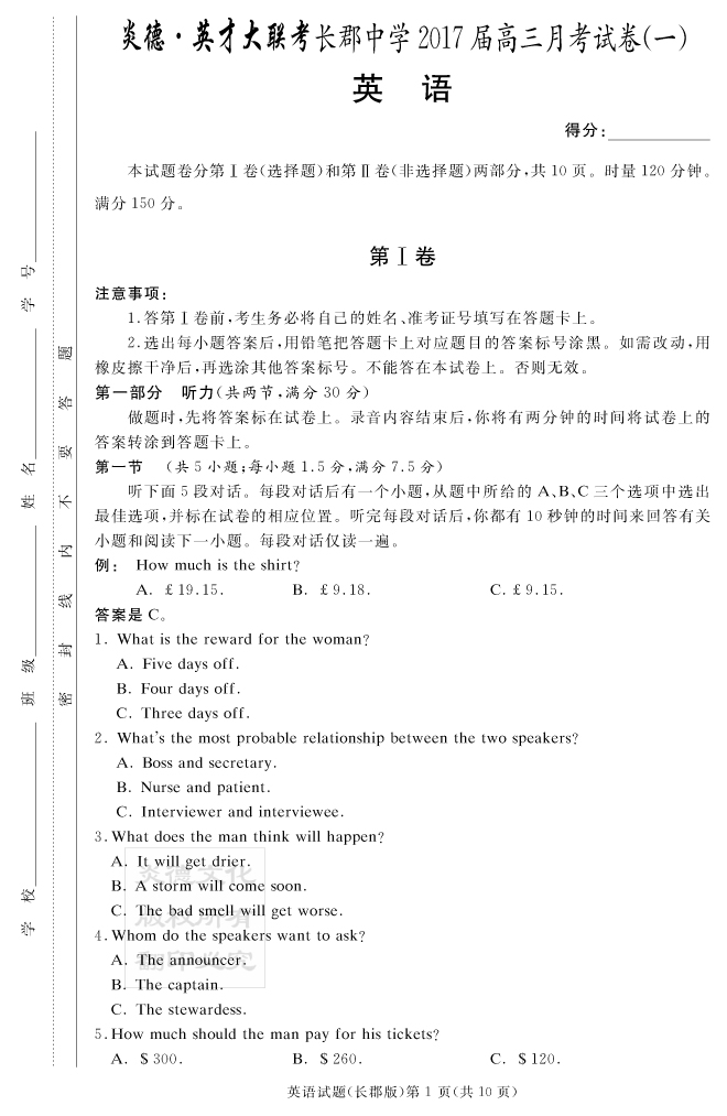 【英語】炎德英才大聯(lián)考2017長郡中學(xué)高三1次月考