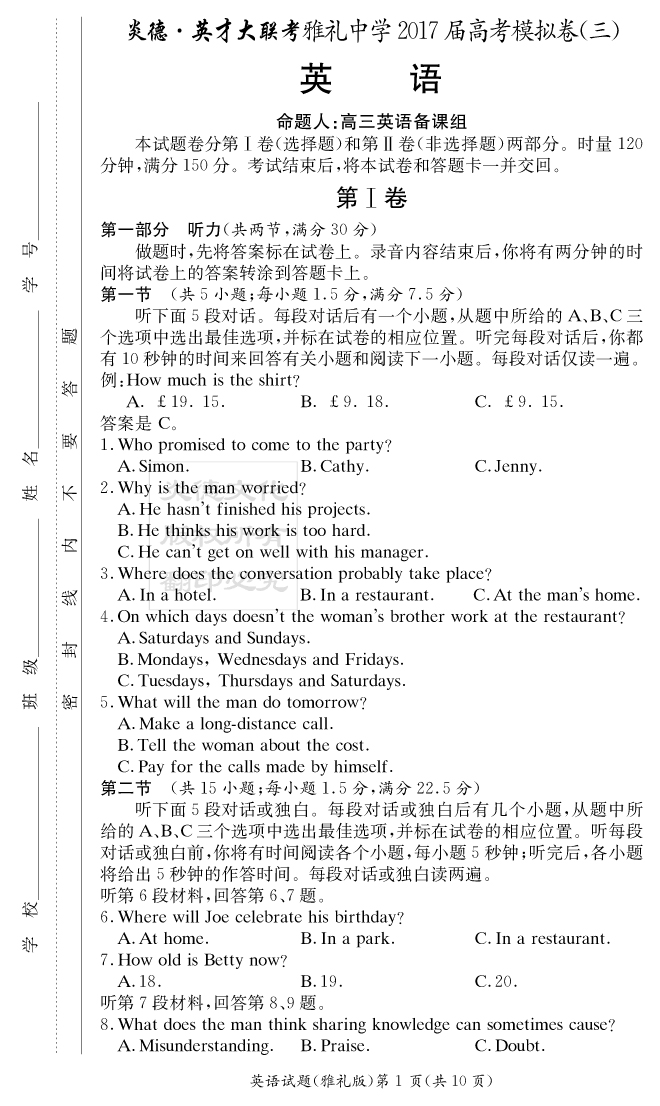 【英語(yǔ)】炎德英才大聯(lián)考2017雅禮中學(xué)高三10次月考(模擬三)