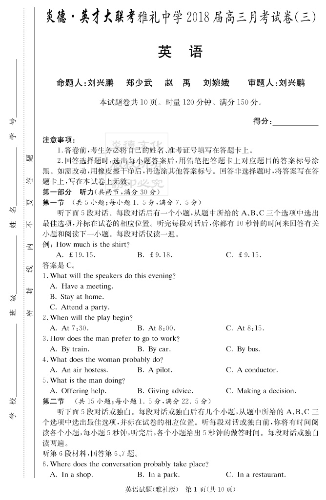 【英語】炎德英才大聯(lián)考2018雅禮中學(xué)高三3次月考