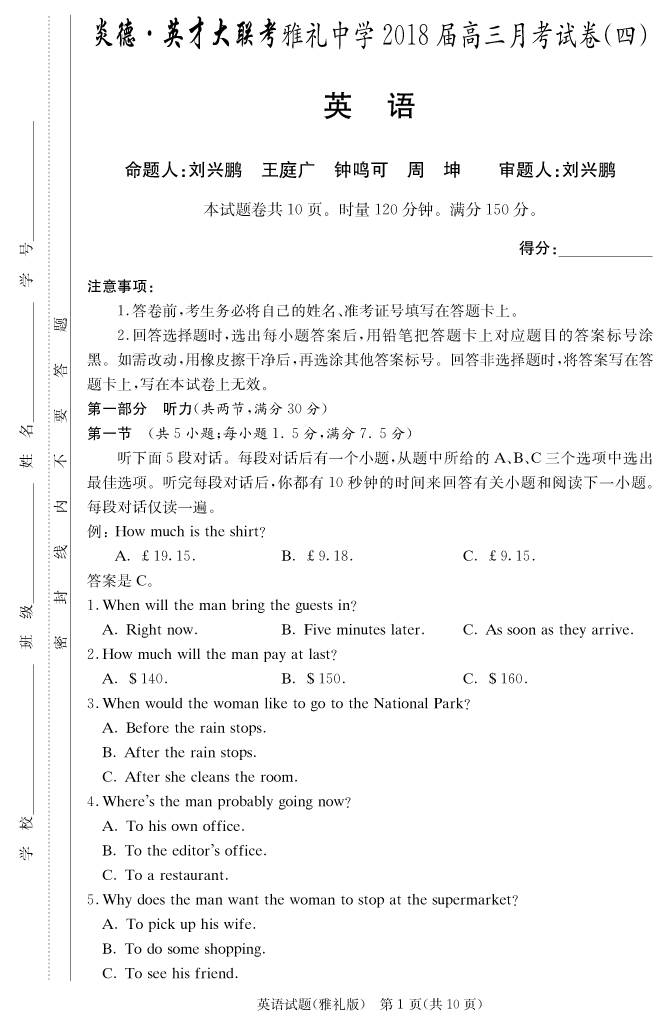 【英語(yǔ)】炎德英才大聯(lián)考2018雅禮中學(xué)高三4次月考