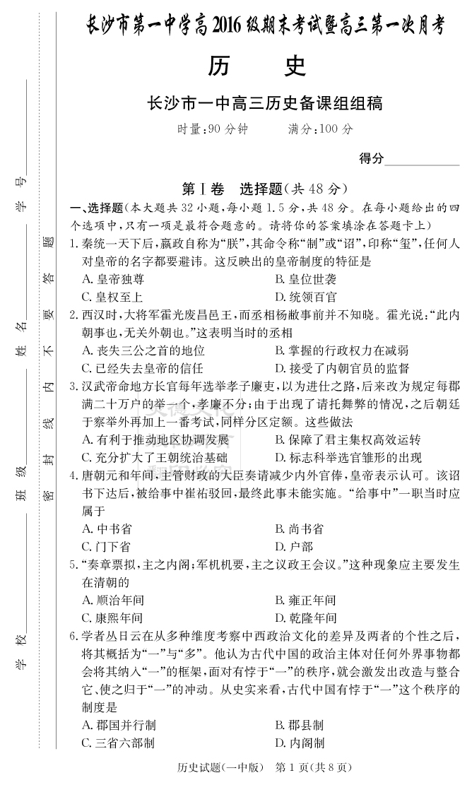 【歷史】炎德英才大聯(lián)考2019長沙一中高三1次月考