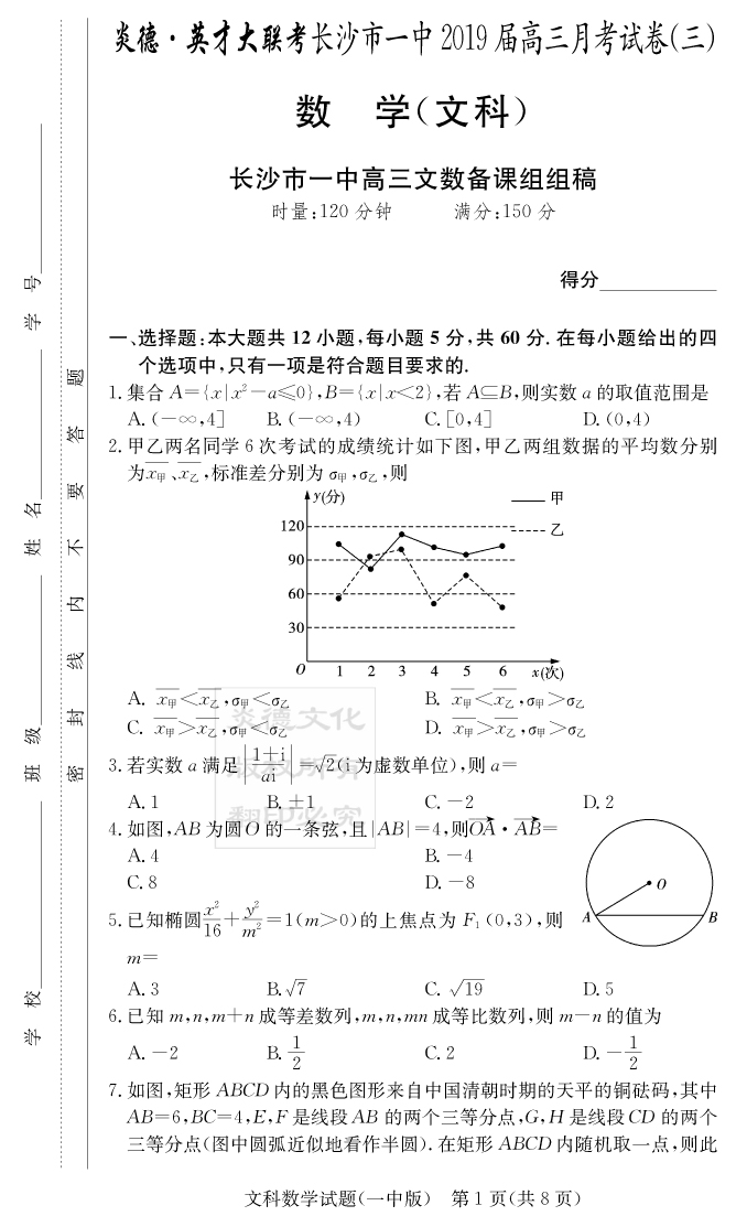 【文數(shù)】炎德英才大聯(lián)考2019長(zhǎng)沙一中高三3次月考