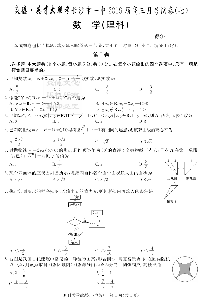 【理數(shù)】炎德英才大聯(lián)考2019長沙一中高三7次月考