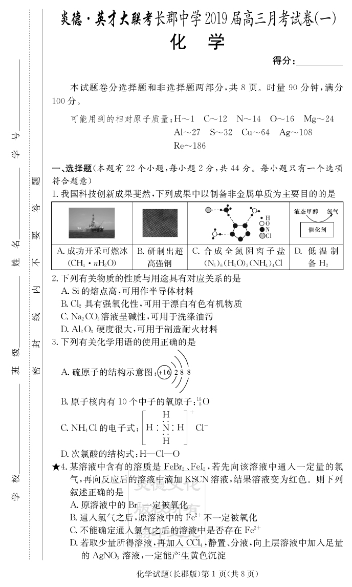 【化學(xué)】炎德英才大聯(lián)考2019長(zhǎng)郡中學(xué)高三1次月考