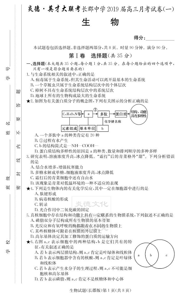 【生物】炎德英才大聯(lián)考2019長(zhǎng)郡中學(xué)高三1次月考