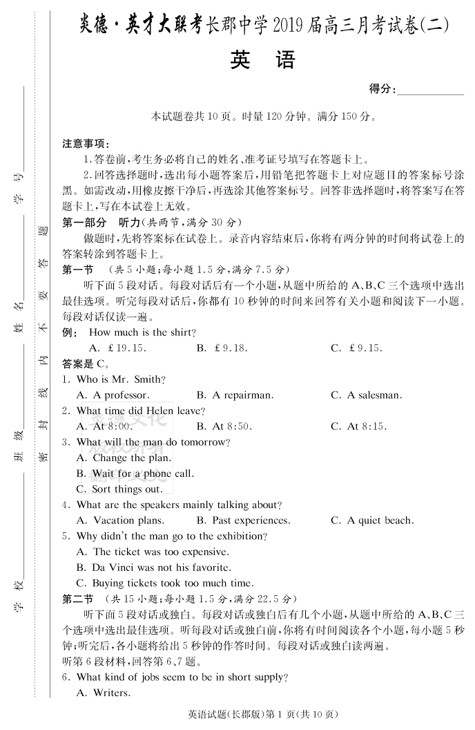 【英語(yǔ)】炎德英才大聯(lián)考2019長(zhǎng)郡中學(xué)高三2次月考