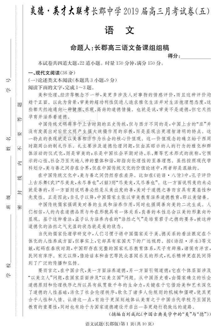 【語文】炎德英才大聯(lián)考2019長郡中學(xué)高三5次月考