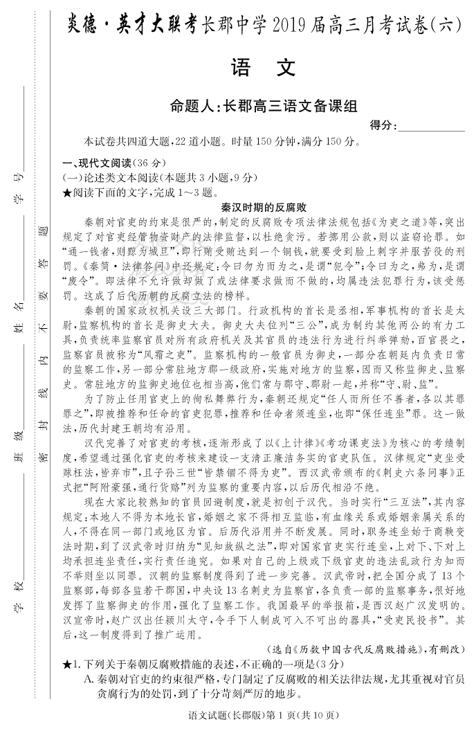【語(yǔ)文】炎德英才大聯(lián)考2019長(zhǎng)郡中學(xué)高三6次月考