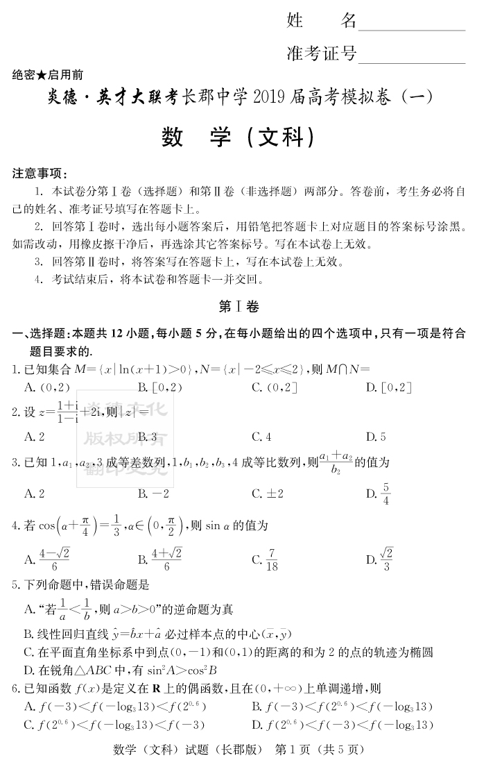 【文數(shù)】炎德英才大聯(lián)考2019長郡中學(xué)高三9次月考(模擬一)