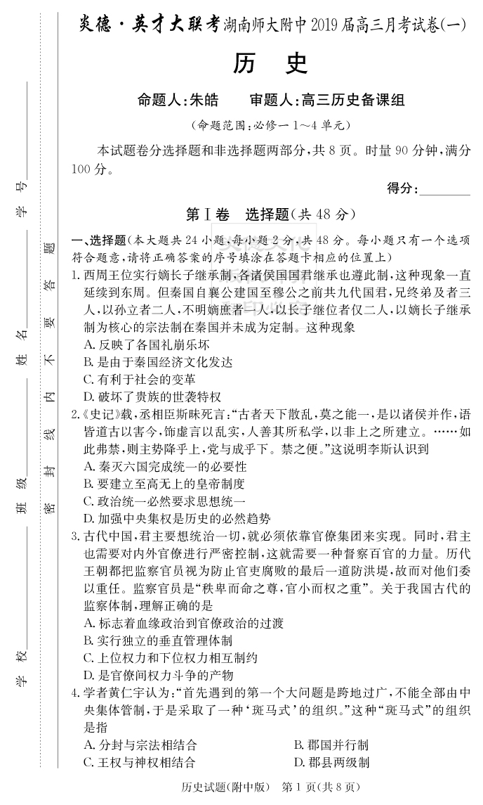 【歷史】炎德英才大聯(lián)考2019師大附中高三1次月考