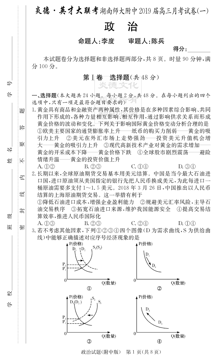 【政治】炎德英才大聯(lián)考2019師大附中高三1次月考