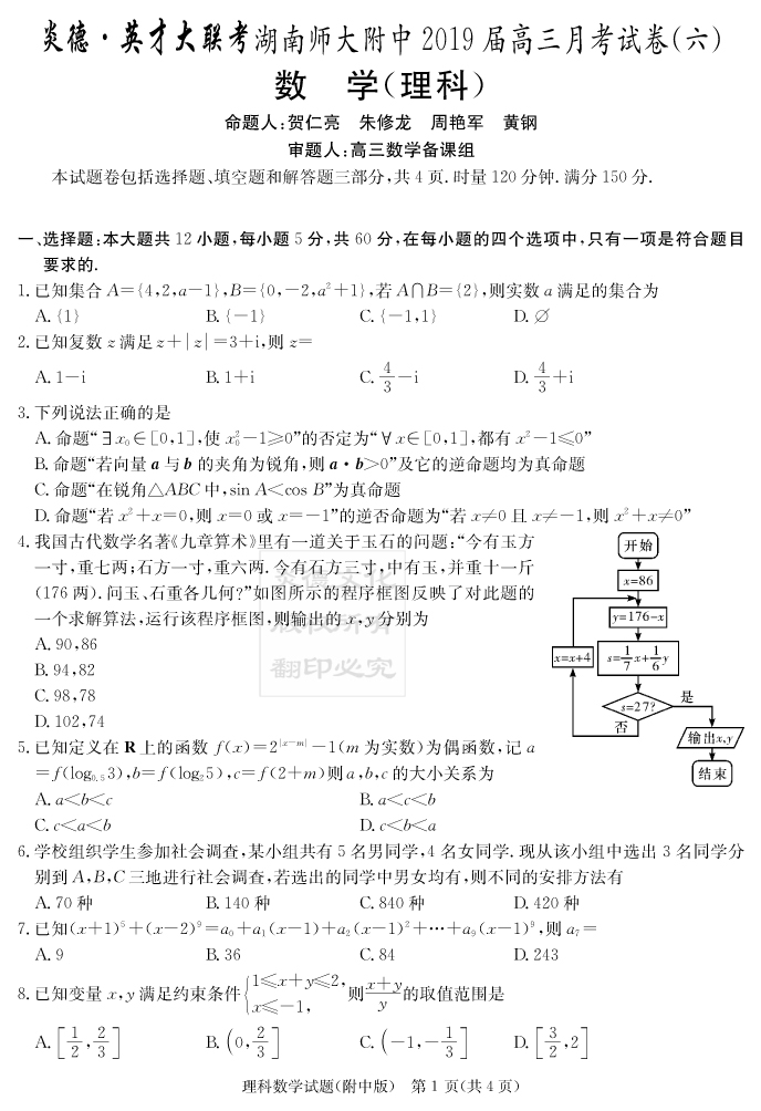 【理數(shù)】炎德英才大聯(lián)考2019師大附中高三6次月考