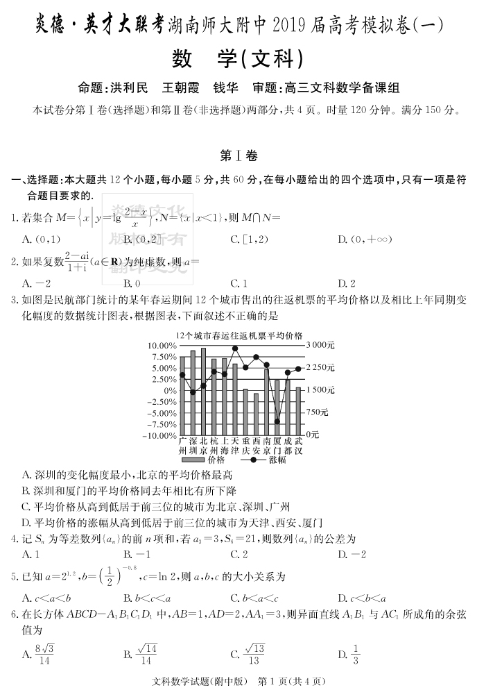 【文數(shù)】炎德英才大聯(lián)考2019師大附中高三8次月考(模擬一)