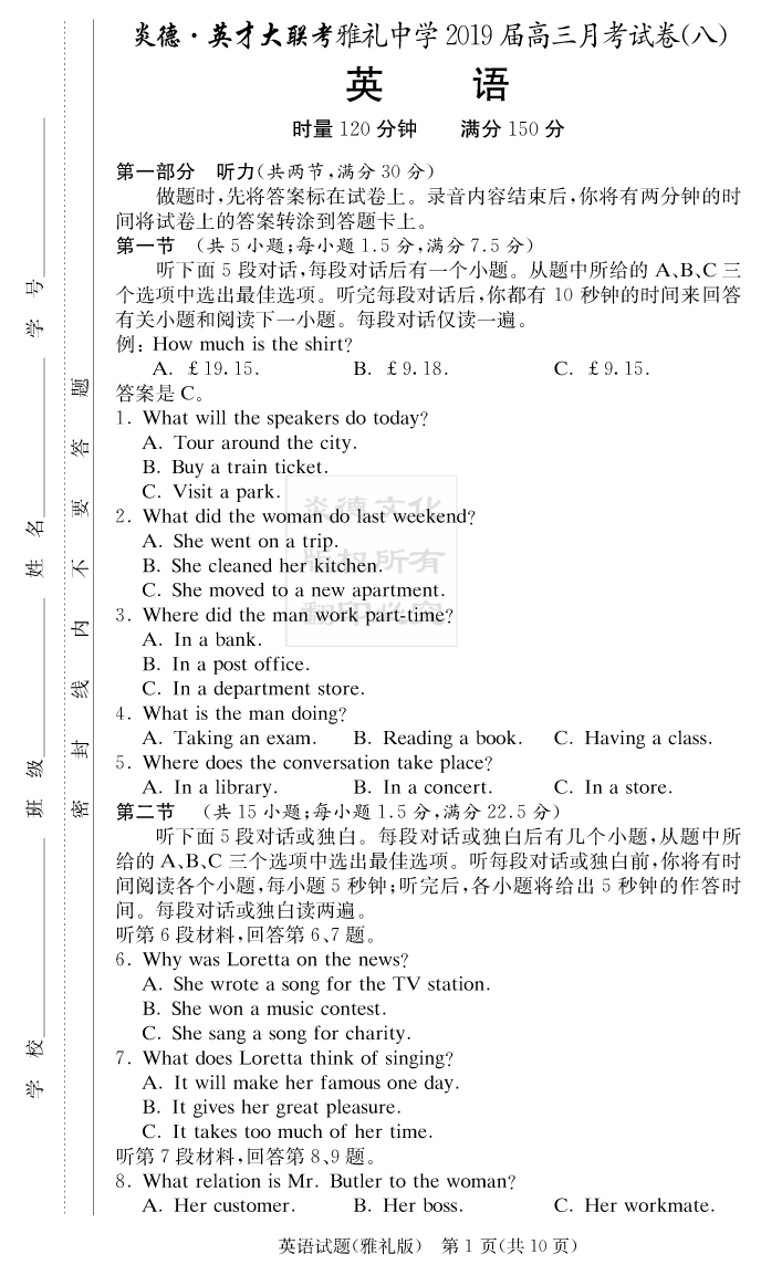 【英語】炎德英才大聯(lián)考2019雅禮中學(xué)高三8次月考