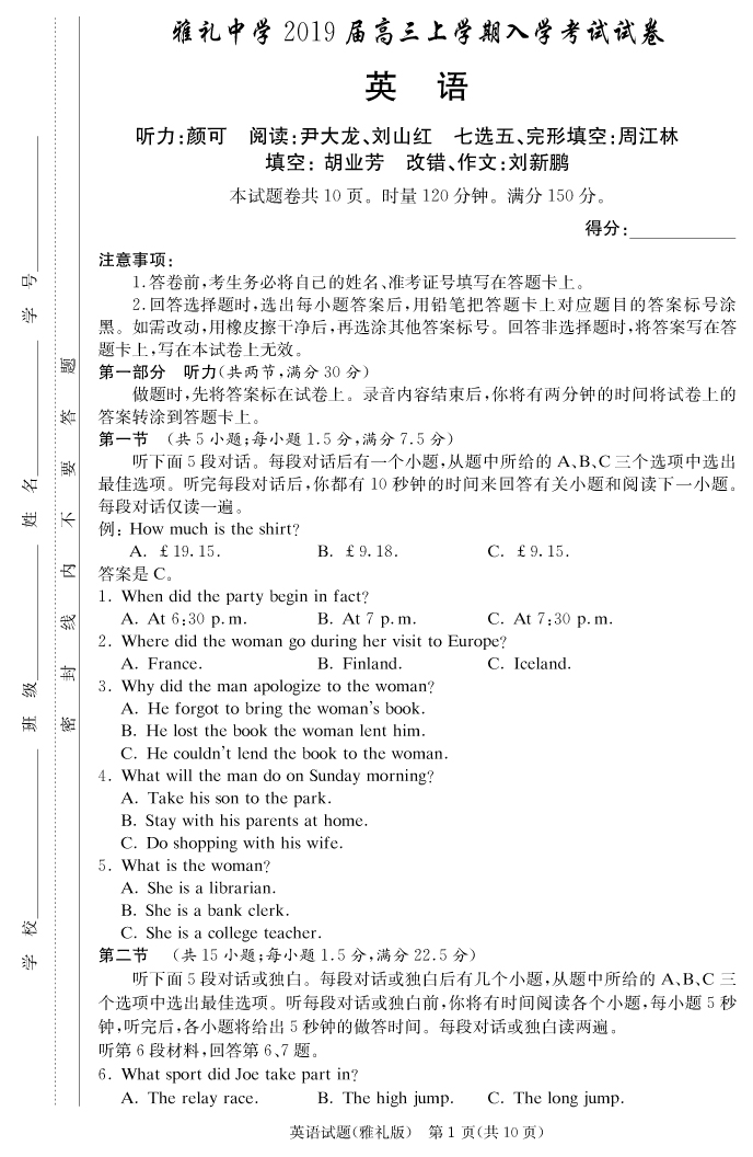 【英語】雅禮中學(xué)2019屆高三上學(xué)期入學(xué)考試