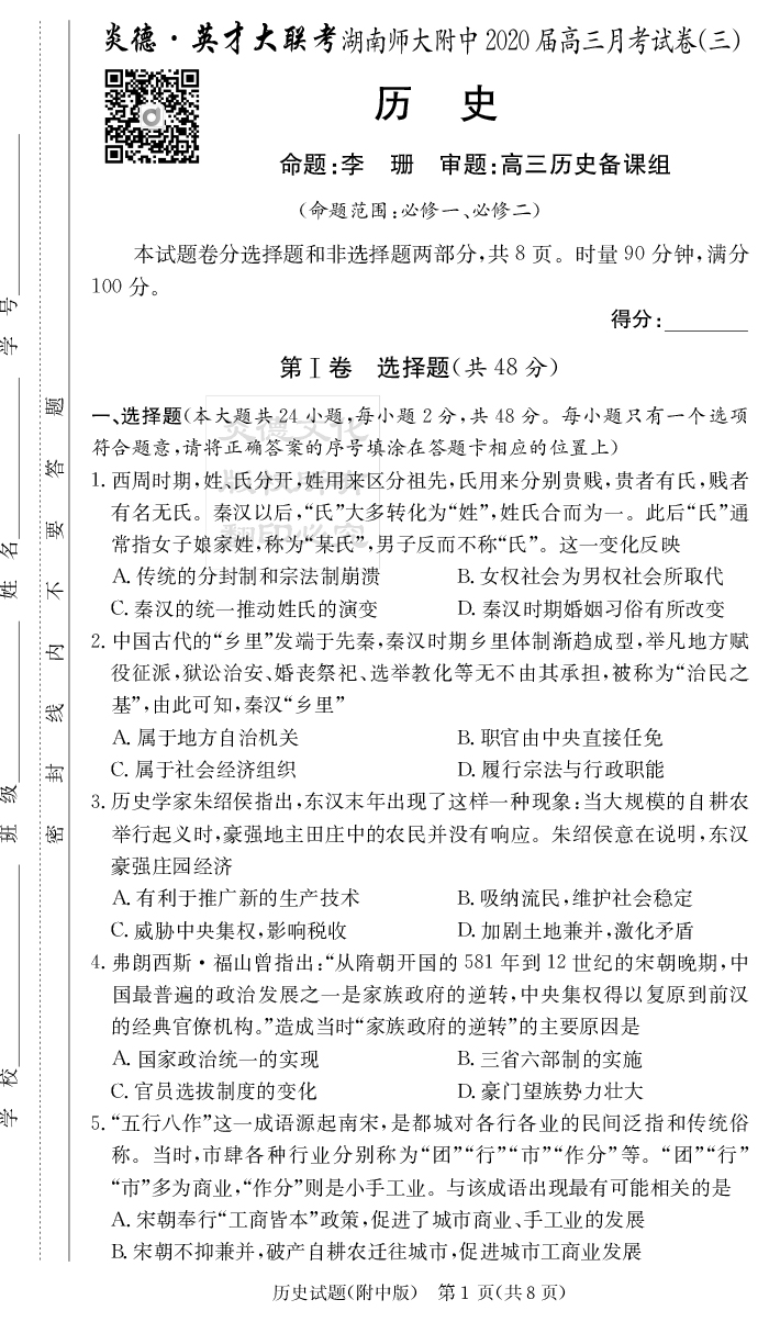 【歷史】炎德英才大聯(lián)考2020屆師大附中高三3次月考