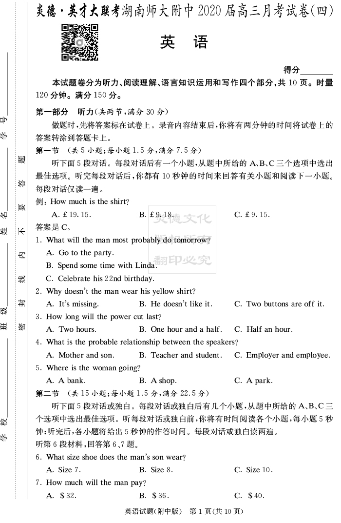 【英語】炎德英才大聯(lián)考2020屆師大附中高三4次月考