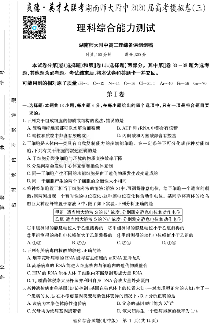 2025湖南師大附中新高考考前小題訓練·生物