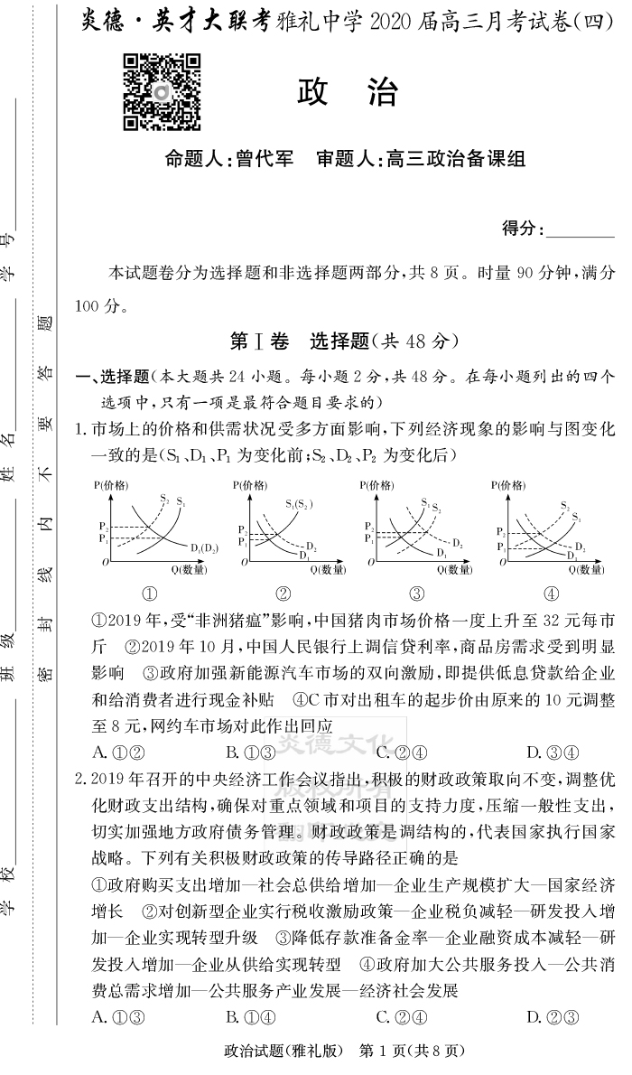【政治】炎德英才大聯(lián)考2020屆雅禮中學(xué)高三4次月考