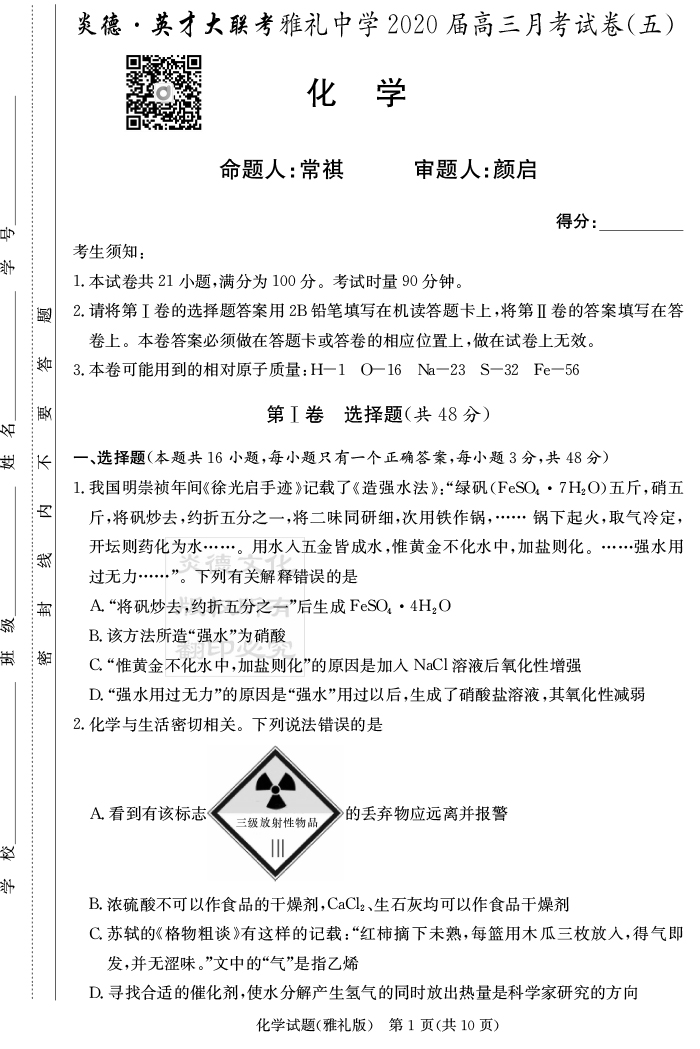 【化學(xué)】炎德英才大聯(lián)考2020屆雅禮中學(xué)高三5次月考