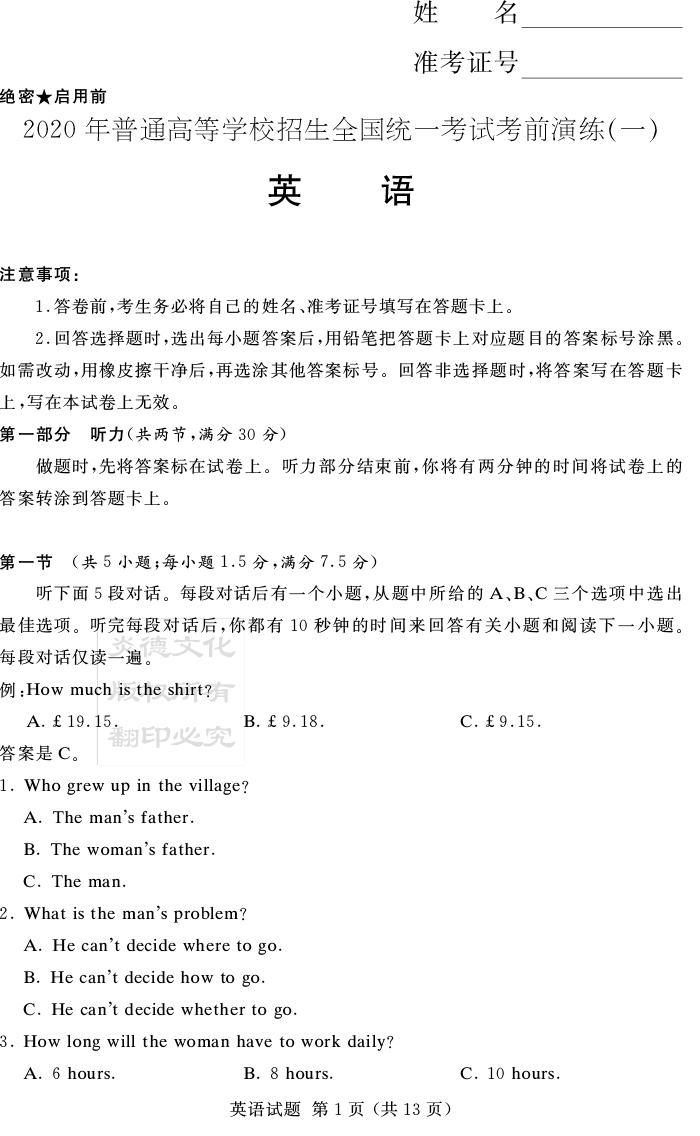 【英語】2020年普通高等學(xué)校招生全國統(tǒng)一考試考前演練(一)