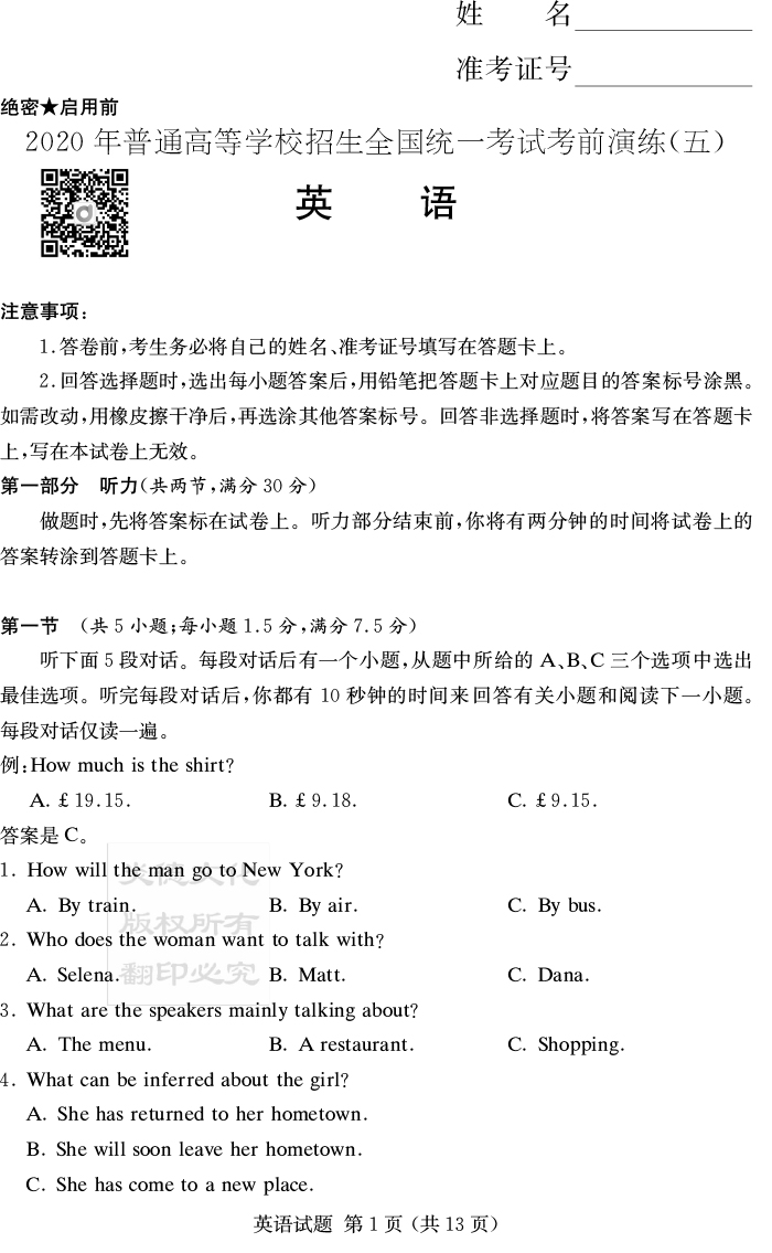 下一篇:【語文】2020年普通高等學校招生全國統(tǒng)一考試考前演練(五)