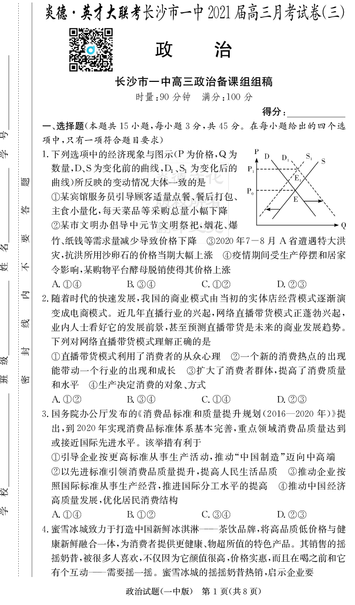 2025長郡中學新高考考前小題沖刺訓練·政治
