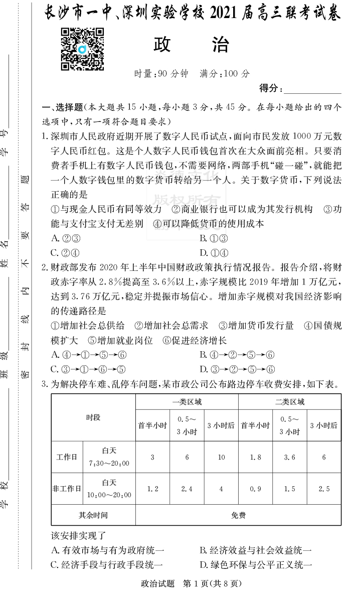 【政治】炎德英才大聯(lián)考2021屆長(zhǎng)沙市一中高三4次月考