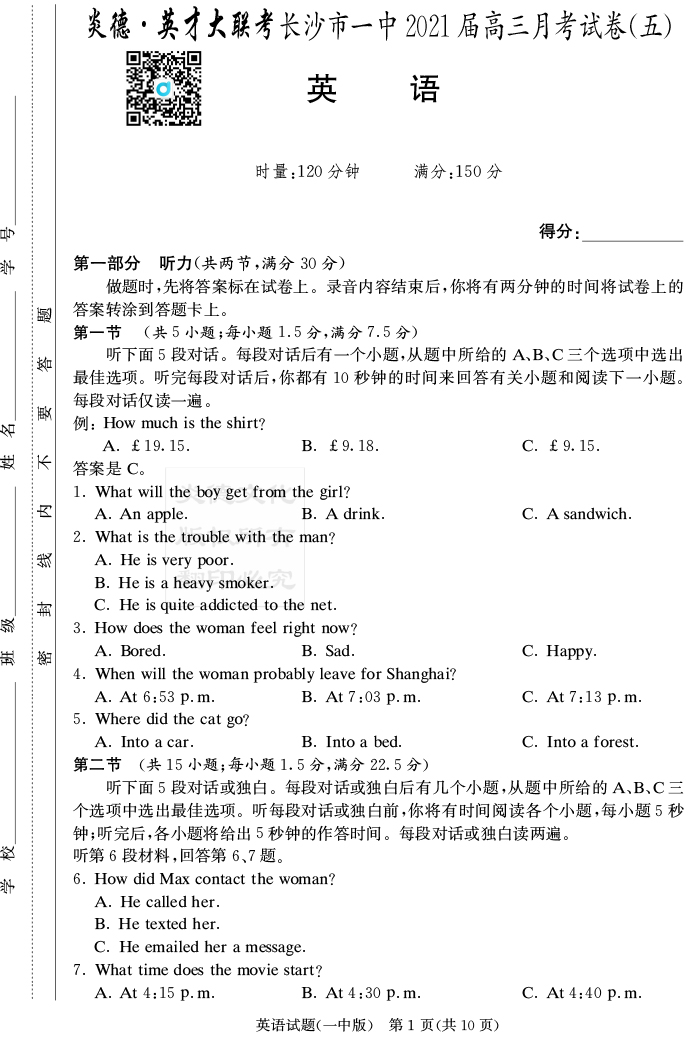 【英語】炎德英才大聯(lián)考2021屆長沙市一中高三5次月考
