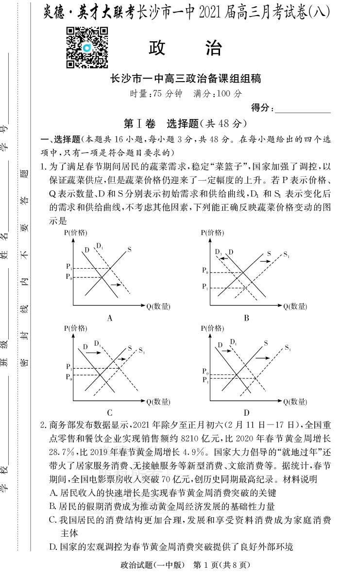 2025長郡中學新高考考前小題沖刺訓練·政治