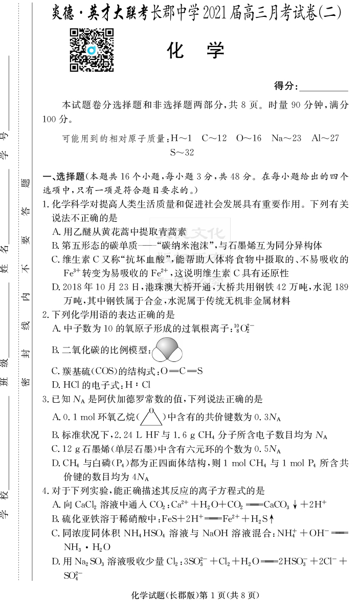 2025長郡中學新高考考前小題沖刺訓練·化學
