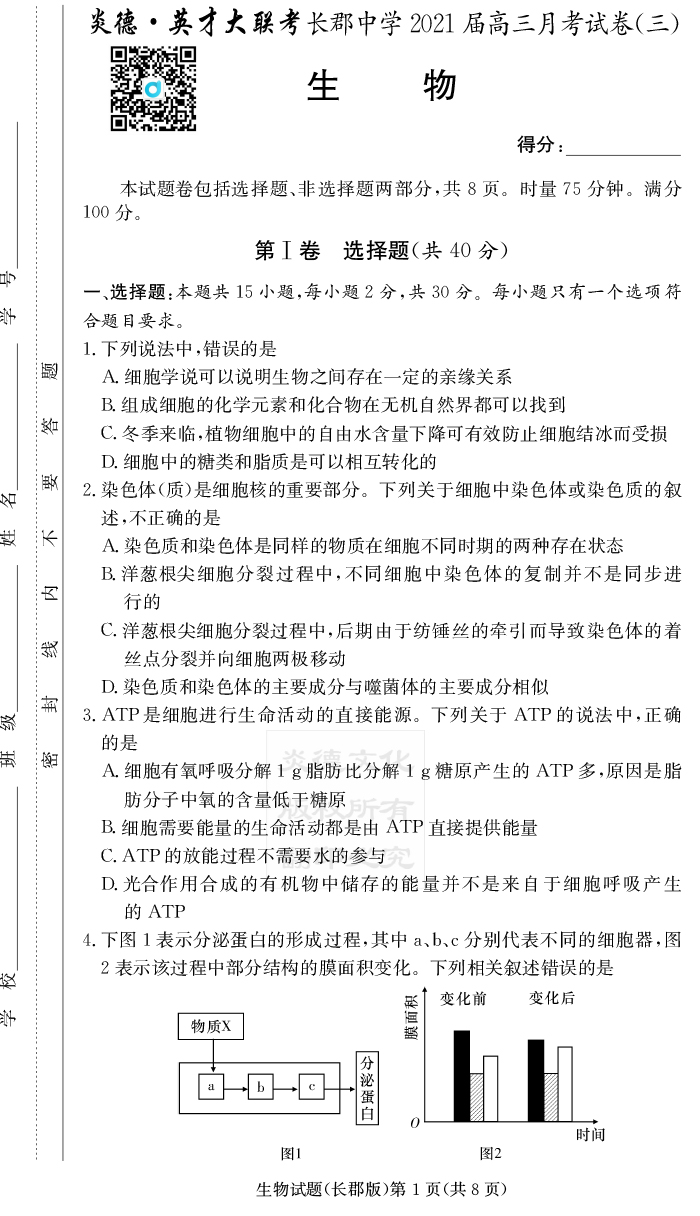 2025長郡中學新高考考前小題沖刺訓練·生物