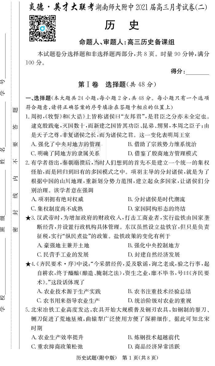 2025長郡中學新高考考前小題沖刺訓練·歷史