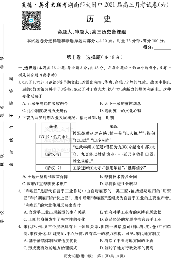 2025長郡中學新高考考前小題沖刺訓練·歷史