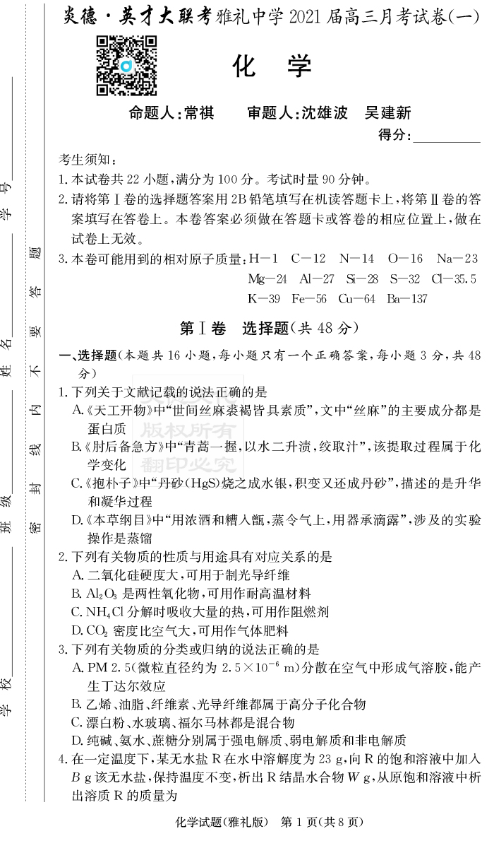 【化學(xué)】炎德英才大聯(lián)考2021屆雅禮中學(xué)高三1次月考