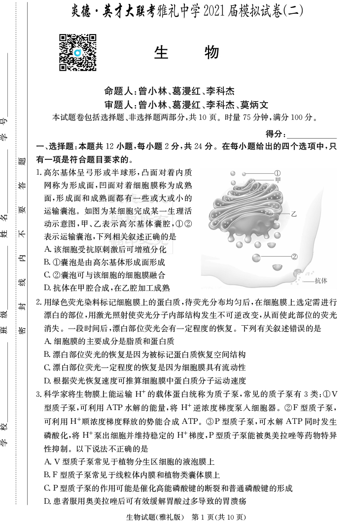 【生物】炎德英才大聯(lián)考2021屆雅禮中學(xué)高三10次月考(模擬二)