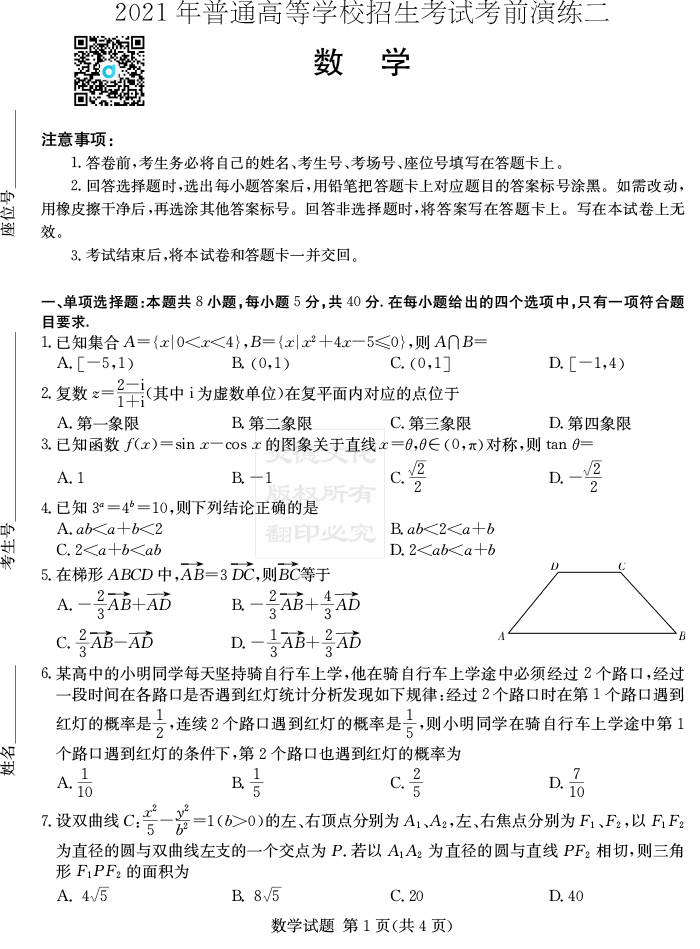 【數(shù)學(xué)】2021年普通高等學(xué)校招生全國統(tǒng)一考試考前演練(二)