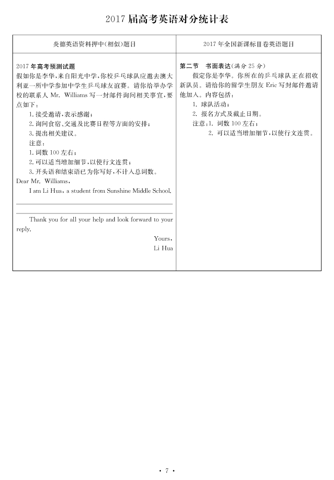 2017高考全國(guó)卷Ⅲ對(duì)分表-英語(yǔ)