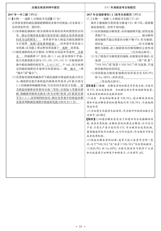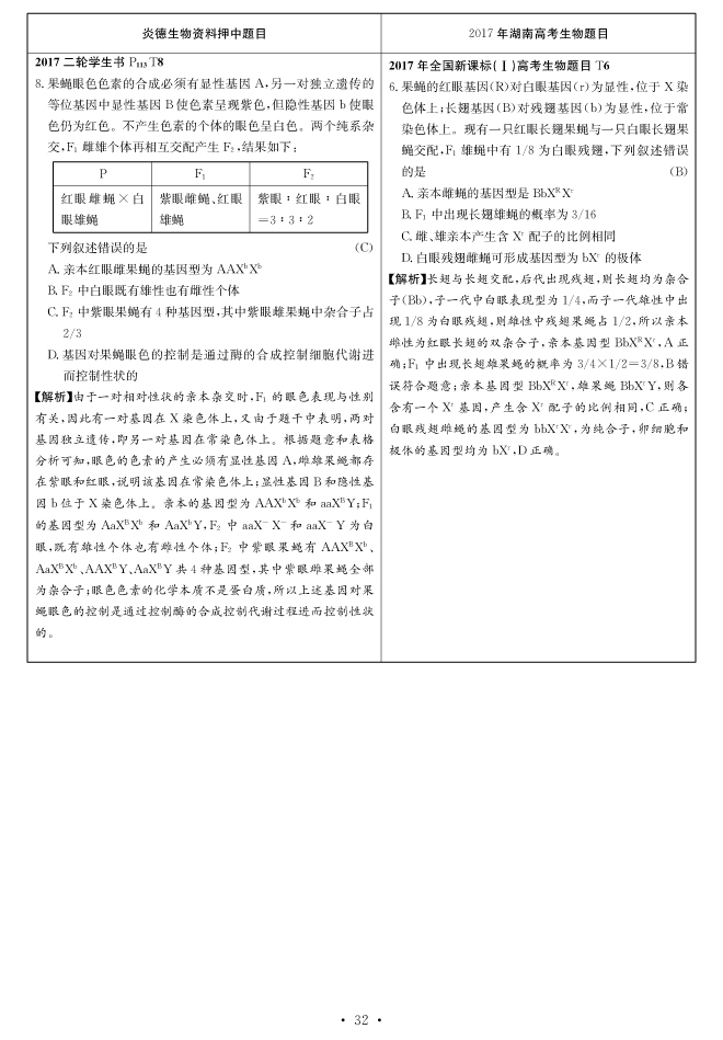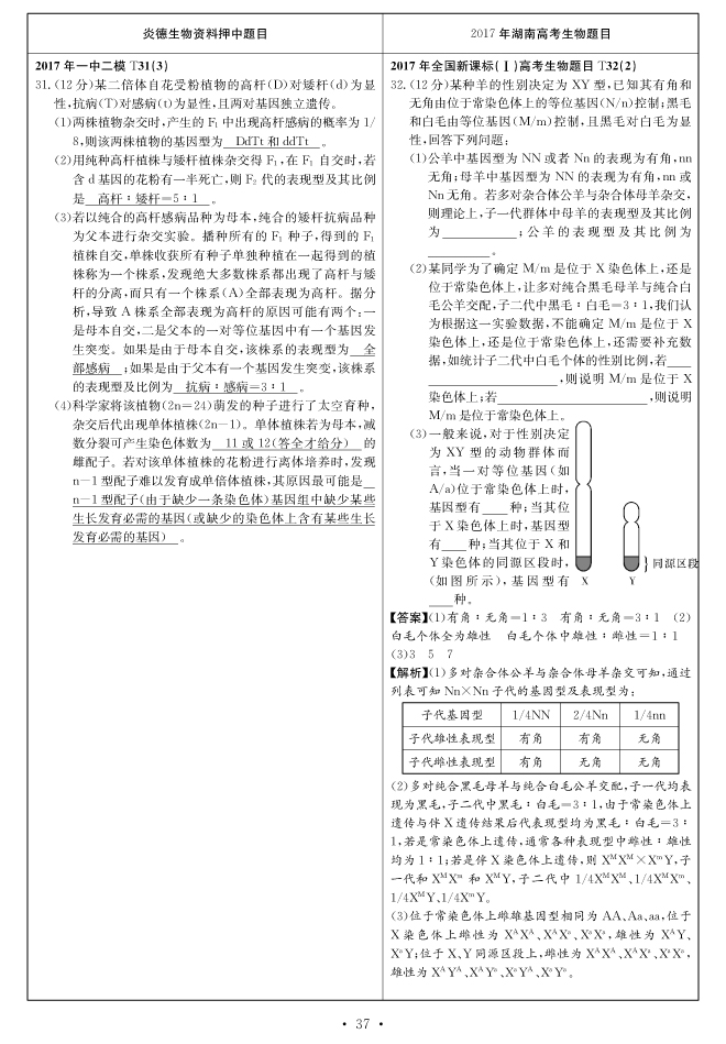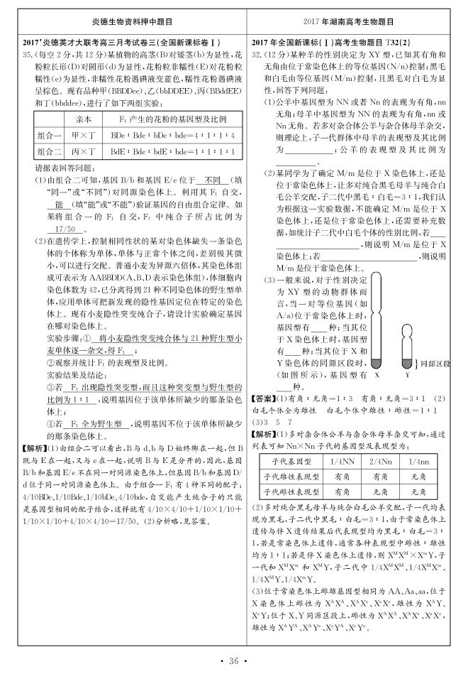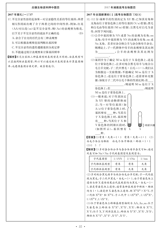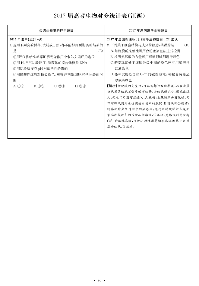 2017高考全國新課標(biāo)卷Ⅰ對(duì)分表-生物