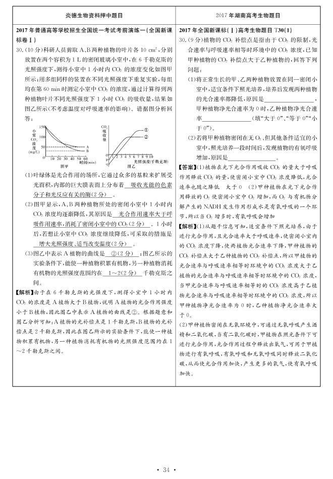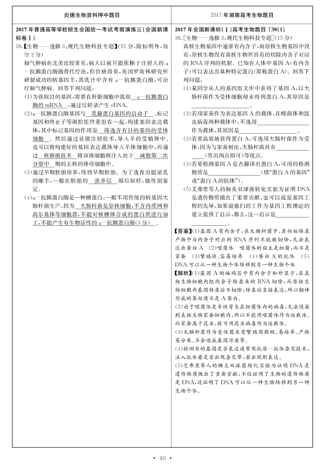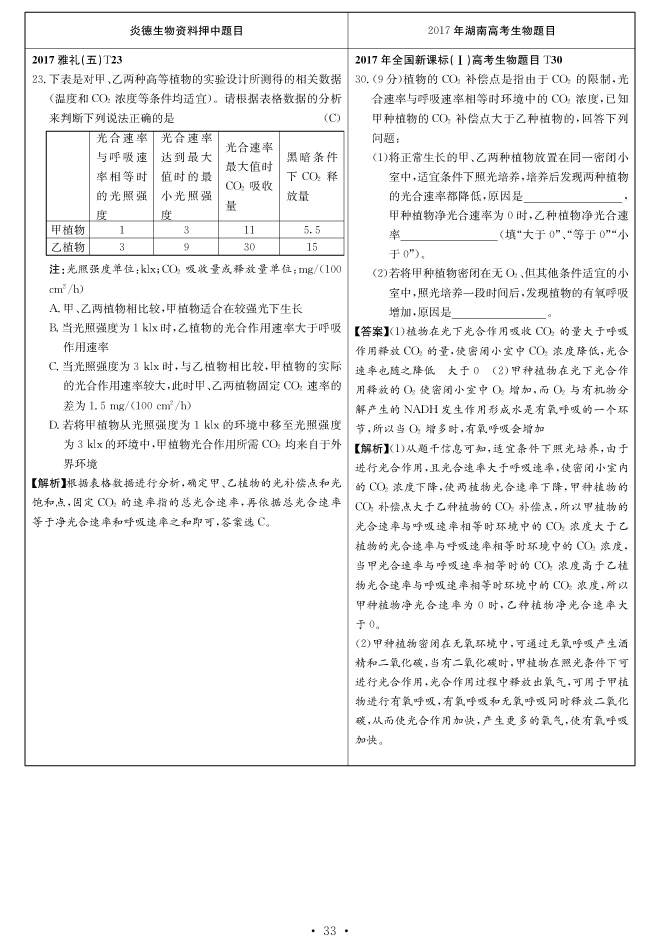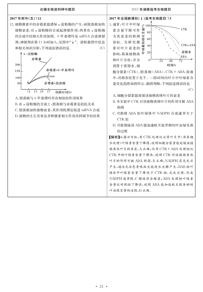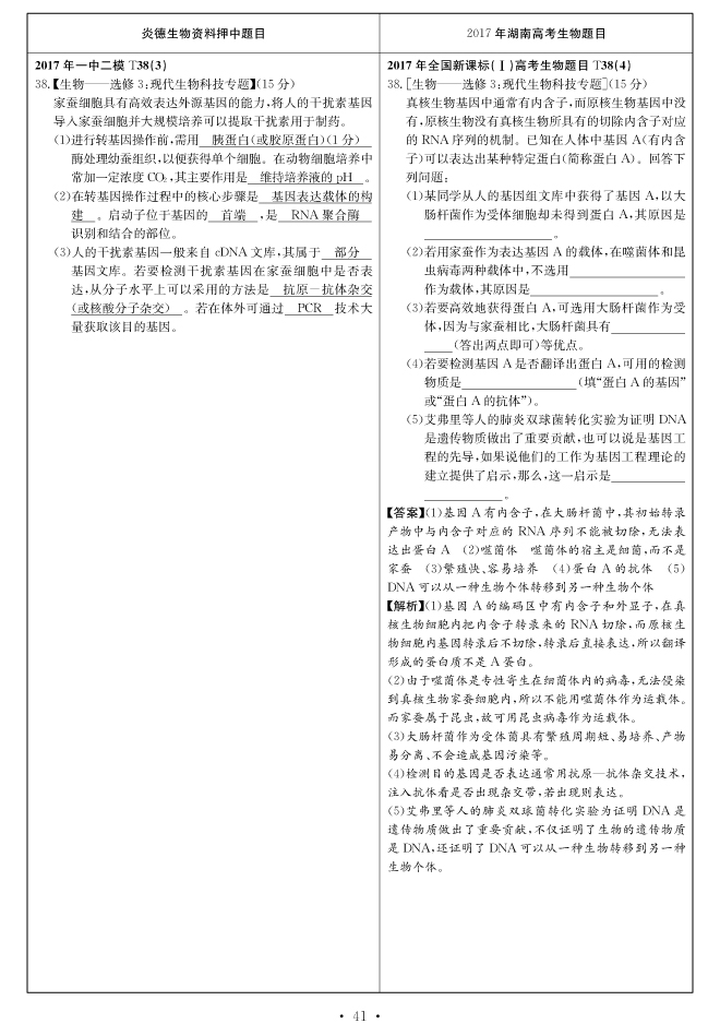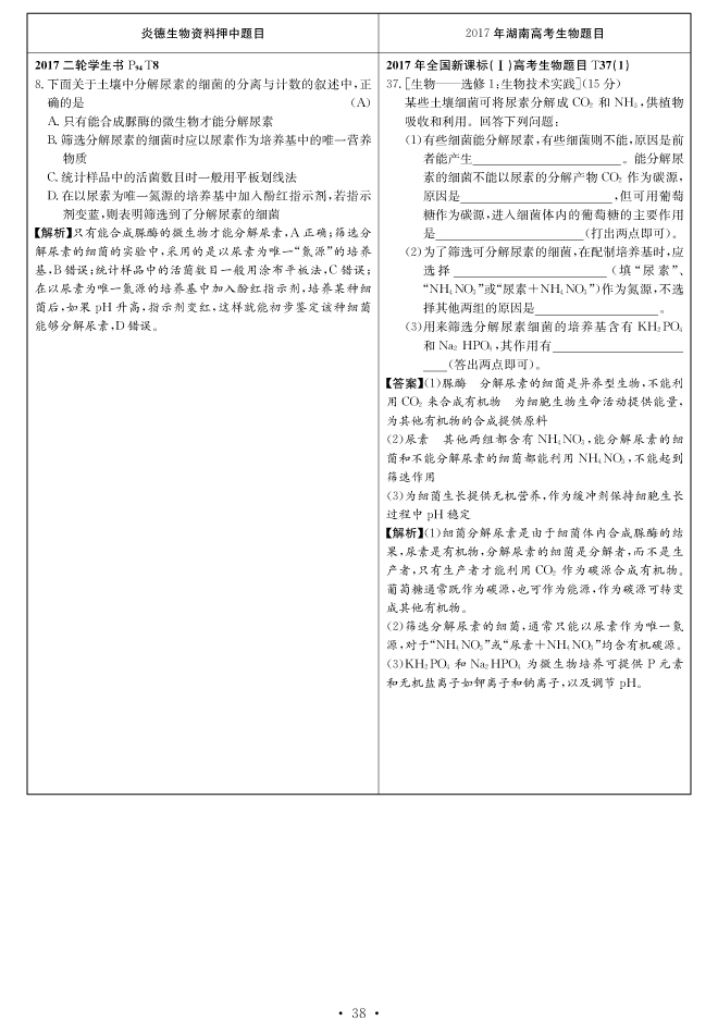 2017高考全國新課標(biāo)卷Ⅰ對(duì)分表-生物