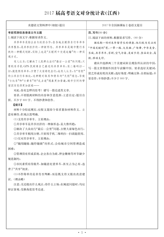 2017高考全國(guó)新課標(biāo)卷Ⅰ對(duì)分表-語(yǔ)文