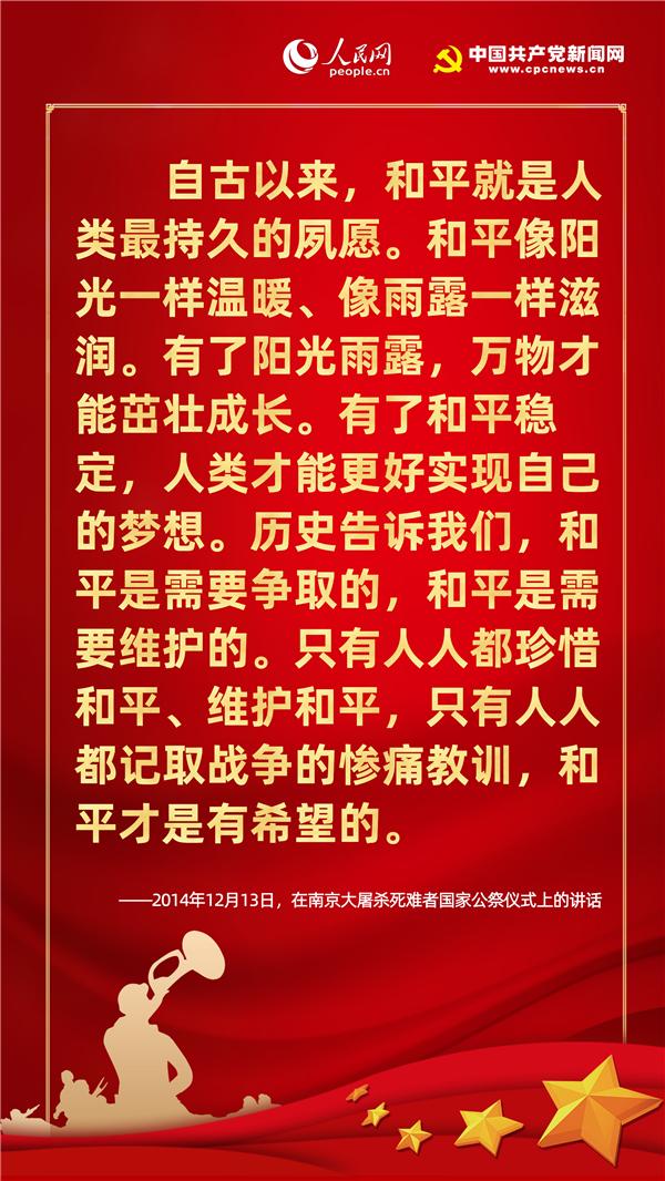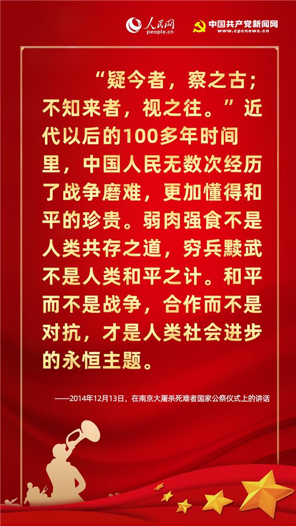 歷史不僅關(guān)乎過去,更關(guān)乎現(xiàn)在和未來。紀(jì)念歷史不是為了咀嚼苦難、延續(xù)仇恨,而是為了重申和平與正義的價值,從歷史中汲取智慧,獲得開創(chuàng)未來的精神力量。在七七事變83周年的今天,人民網(wǎng)·中國共產(chǎn)黨新聞網(wǎng)梳理十八大以來習(xí)近平總書記有關(guān)“戰(zhàn)爭與和平”的重要論述,讓我們一起“銘記歷史、緬懷先烈、珍視和平、警示未來”。