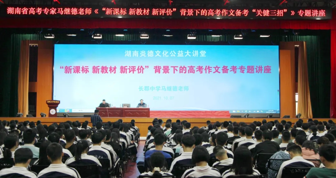 “乘騏驥以馳騁兮,來(lái)吾道夫先路。”金秋十月,大美校園,風(fēng)送桂香,最是高三學(xué)子發(fā)奮時(shí)。2021年10月7日下午,望城二中攜手湖南炎德文化實(shí)業(yè)有限公司,舉辦主題為“新高考背景下高考命題特點(diǎn)及沖刺策略(語(yǔ)文學(xué)科)”的教育服務(wù)公益活動(dòng)。高三年級(jí)全體班主任、語(yǔ)文教師及學(xué)生齊聚俊德樓三樓報(bào)告廳,在特邀專(zhuān)家馬繼德老師的引領(lǐng)下,探尋高考作文備考之路。