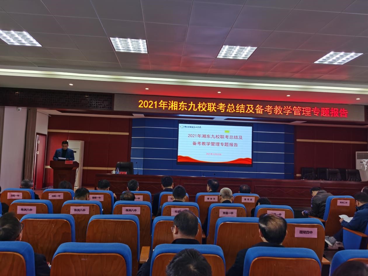 2021年12月22日上午,湘東九校2021年12月高三聯(lián)考總結(jié)會議在醴陵市四中召開,醴陵市四中、株洲市二中、醴陵市一中、瀏陽市一中、攸縣一中、茶陵縣一中、株洲市八中、株洲市四中、株洲市九方中學(xué)領(lǐng)導(dǎo)和專家參加。