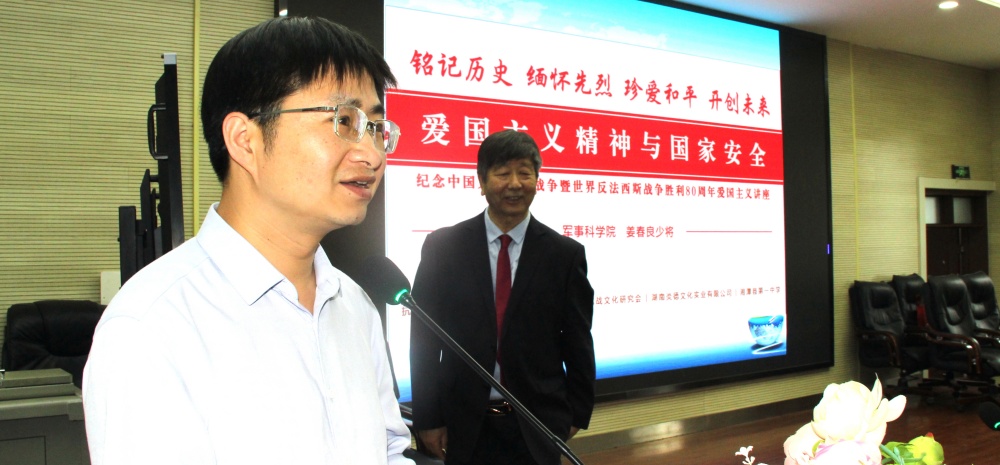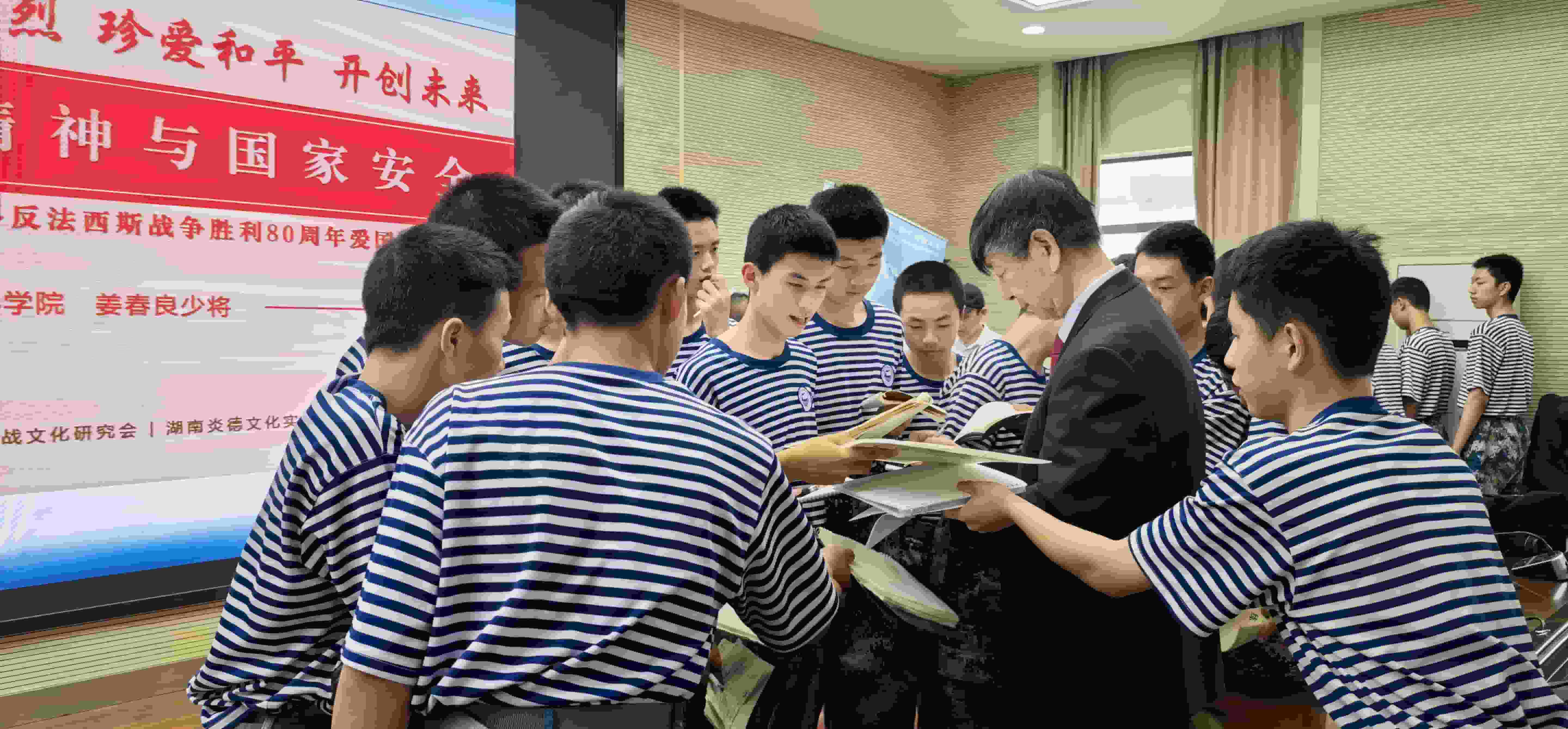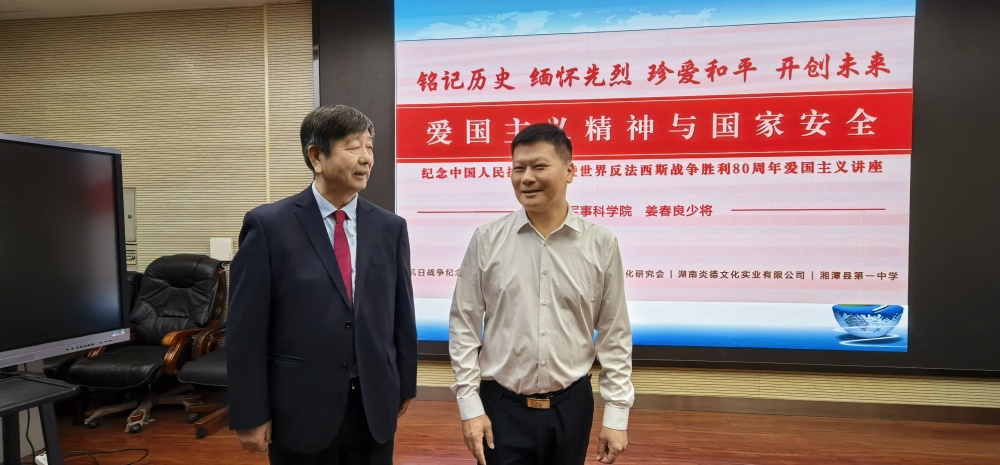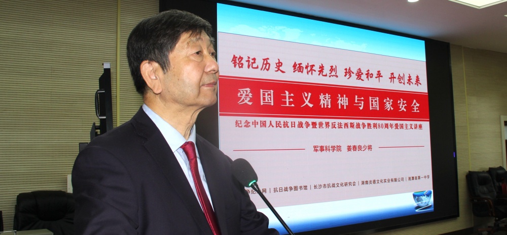 為紀(jì)念中國(guó)人民抗日戰(zhàn)爭(zhēng)暨世界反法西斯戰(zhàn)爭(zhēng)勝利80周年,弘揚(yáng)偉大抗戰(zhàn)精神,深化青少年愛(ài)國(guó)主義教育,湖南炎德文化實(shí)業(yè)有限公司、抗日戰(zhàn)爭(zhēng)紀(jì)念網(wǎng)、抗日戰(zhàn)爭(zhēng)圖書(shū)館、長(zhǎng)沙市抗戰(zhàn)文化研究會(huì)決定聯(lián)合主辦“銘記歷史 緬懷先烈 珍愛(ài)和平 開(kāi)創(chuàng)未來(lái)”愛(ài)國(guó)主義教育講座,邀請(qǐng)中國(guó)人民解放軍軍事科學(xué)研究院研究員姜春良少將主講《愛(ài)國(guó)主義和國(guó)家安全》。