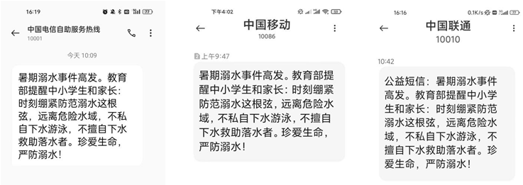 7月13日,教育部、工信部協(xié)調(diào)中國(guó)電信、中國(guó)移動(dòng)、中國(guó)聯(lián)通三大運(yùn)營(yíng)商,向全國(guó)手機(jī)用戶發(fā)送了暑期防溺水公益短信。短信內(nèi)容為:暑期溺水事件高發(fā),教育部提醒中小學(xué)生和家長(zhǎng),時(shí)刻緊繃防范溺水這根弦,遠(yuǎn)離危險(xiǎn)水域,不私自下水游泳,不擅自下水救助落水者。珍愛(ài)生命,嚴(yán)防溺水!不少學(xué)生家長(zhǎng)收到公益短信后表示,孩子安全大意不得,將會(huì)履行好監(jiān)護(hù)職責(zé),高度關(guān)注孩子暑期安全。