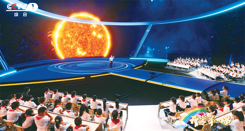 2023年《開學(xué)第一課》以“強國復(fù)興有我”為主題,從傳統(tǒng)文化、文明探源、生態(tài)文明、鄉(xiāng)村振興、國防教育、科技創(chuàng)新等多個方面,全景展示中國式現(xiàn)代化的萬千氣象。圖為中國科學(xué)院高能物理研究所研究員、“拉索”(LHAASO)首席科學(xué)家曹臻在向同學(xué)們介紹世界上海拔最高、規(guī)模最大的宇宙射線觀測裝置“拉索”的前世今生。(教育部供圖)