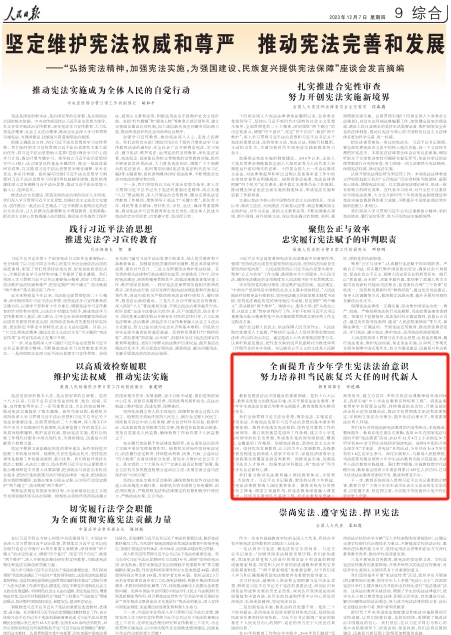 下一步,教育系統(tǒng)將深入貫徹習(xí)近平總書(shū)記重要指示精神,教育引導(dǎo)廣大青少年學(xué)生成為社會(huì)主義法治的忠實(shí)崇尚者、自覺(jué)遵守者、堅(jiān)定捍衛(wèi)者,為實(shí)現(xiàn)中華民族偉大復(fù)興作出新的更大貢獻(xiàn)。(“弘揚(yáng)憲法精神,加強(qiáng)憲法實(shí)施,為強(qiáng)國(guó)建設(shè)、民族復(fù)興提供憲法保障”座談會(huì)發(fā)言摘編 本文刊發(fā)于《人民日?qǐng)?bào)》2023年12月07日第09版)