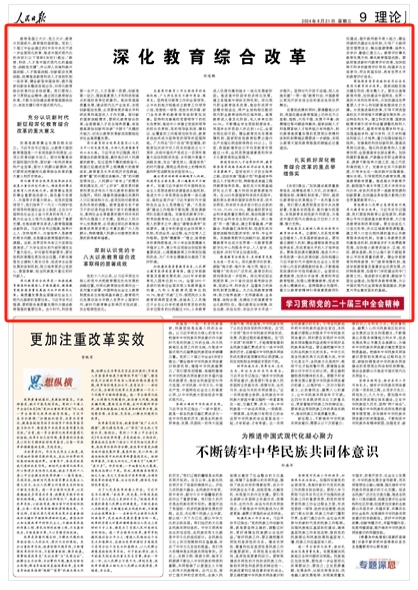 教育是國(guó)之大計(jì)、黨之大計(jì),教育興則國(guó)家興,教育強(qiáng)則國(guó)家強(qiáng)。黨的二十屆三中全會(huì)通過(guò)的《中共中央關(guān)于進(jìn)一步全面深化改革、推進(jìn)中國(guó)式現(xiàn)代化的決定》(以下簡(jiǎn)稱《決定》)提出:“教育、科技、人才是中國(guó)式現(xiàn)代化的基礎(chǔ)性、戰(zhàn)略性支撐”,并從深入實(shí)施科教興國(guó)戰(zhàn)略、人才強(qiáng)國(guó)戰(zhàn)略、創(chuàng)新驅(qū)動(dòng)發(fā)展戰(zhàn)略,統(tǒng)籌推進(jìn)教育科技人才體制機(jī)制一體改革,健全新型舉國(guó)體制,提升國(guó)家創(chuàng)新體系整體效能出發(fā),對(duì)深化教育綜合改革作出系統(tǒng)部署。我們要深入學(xué)習(xí)貫徹全會(huì)精神,通過(guò)深化教育綜合改革,不斷為加快建設(shè)教育強(qiáng)國(guó)提供動(dòng)力,有效支撐引領(lǐng)中國(guó)式現(xiàn)代化。