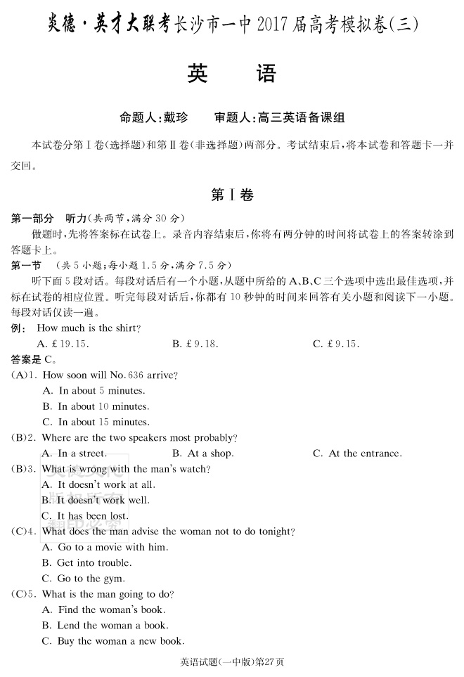 【英語(yǔ)】炎德英才大聯(lián)考2017長(zhǎng)沙一中高三12次月考(模擬三)